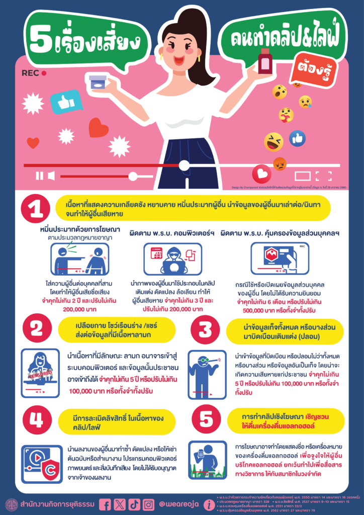 ในยุคที่การทำ คลิปวิดีโอและไลฟ์สด บนโซเชียลมีเดียกลายเป็นส่วนหนึ่งของชีวิตประจำวัน ไม่ว่าจะเพื่อความบันเทิง การขายสินค้า หรือการสื่อสารกับสาธารณะ ผู้สร้างคอนเทนต์จำเป็นต้องรู้เท่าทันกฎหมาย เพราะบางพฤติกรรมที่ดูเหมือนไม่ร้ายแรง อาจเข้าข่าย ความผิดทางกฎหมาย และมีโทษทั้งจำคุกและปรับ 5 เรื่องเสี่ยงที่คนทำคลิปและไลฟ์ต้องรู้ เพื่อป้องกันการละเมิดสิทธิผู้อื่น และหลีกเลี่ยงการกระทำที่ผิดกฎหมายโดยไม่ตั้งใจ