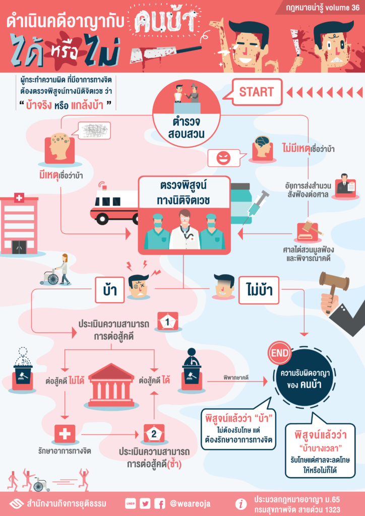 - ถ้ามีเหตุเชื่อว่า “บ้า” ตำรวจ อัยการ และศาลนำตัวผู้กระทำความผิดไปตรวจพิสูจน์ทางนิติจิตเวช