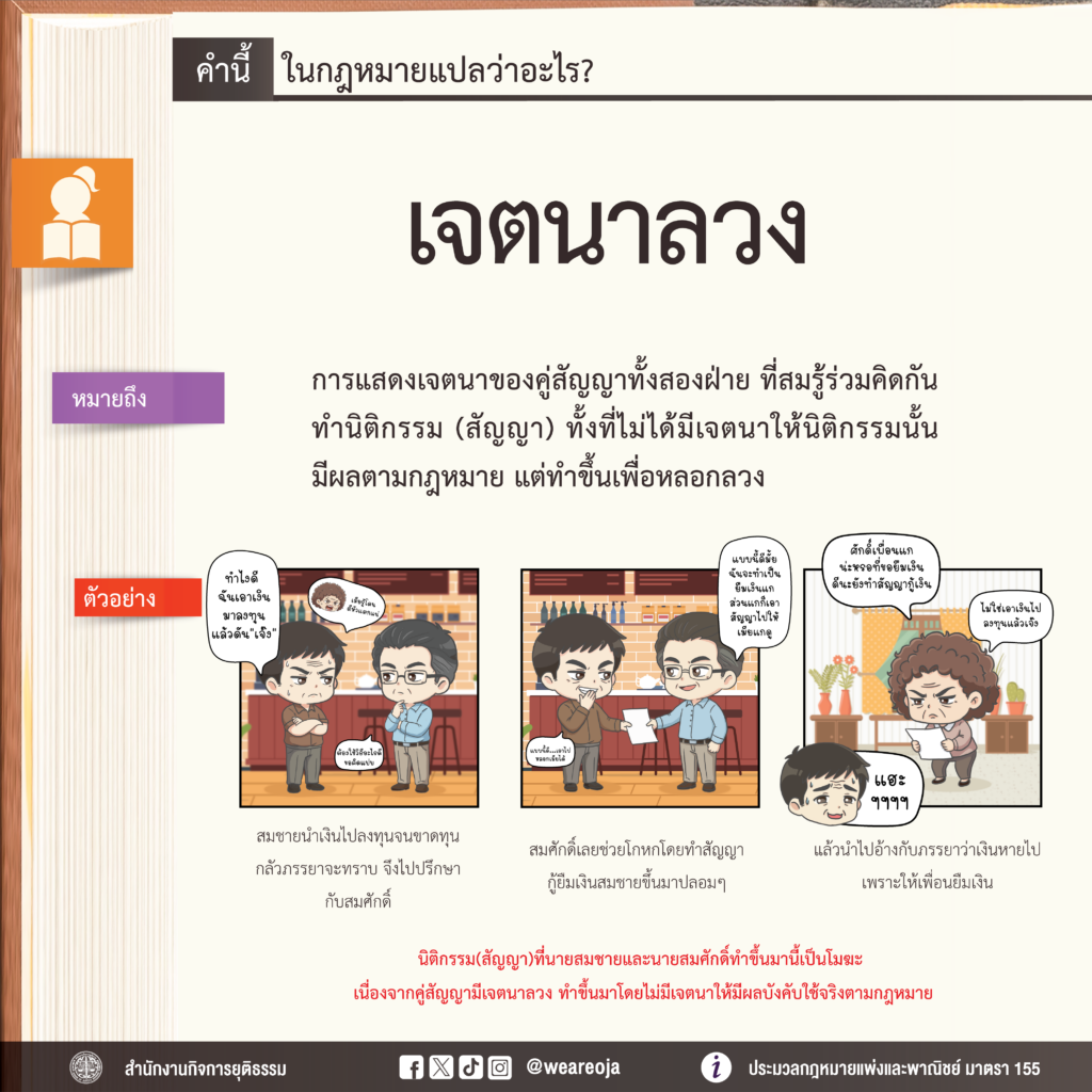 ความหมายของคำว่า เจตนาลวง ในกฎหมายแปลว่า การที่ผู้แสดงเจตนาทั้งสองฝ่ายสมรู้ร่วมคิดกันทำนิติกรรม โดยที่ไม่มีเจตนาให้นิติกรรมนั้นมีผลตามกฎหมาย แต่ทำนิติกรรมนั้นขึ้นเพื่อหลอกลวงบุคคลภายนอก