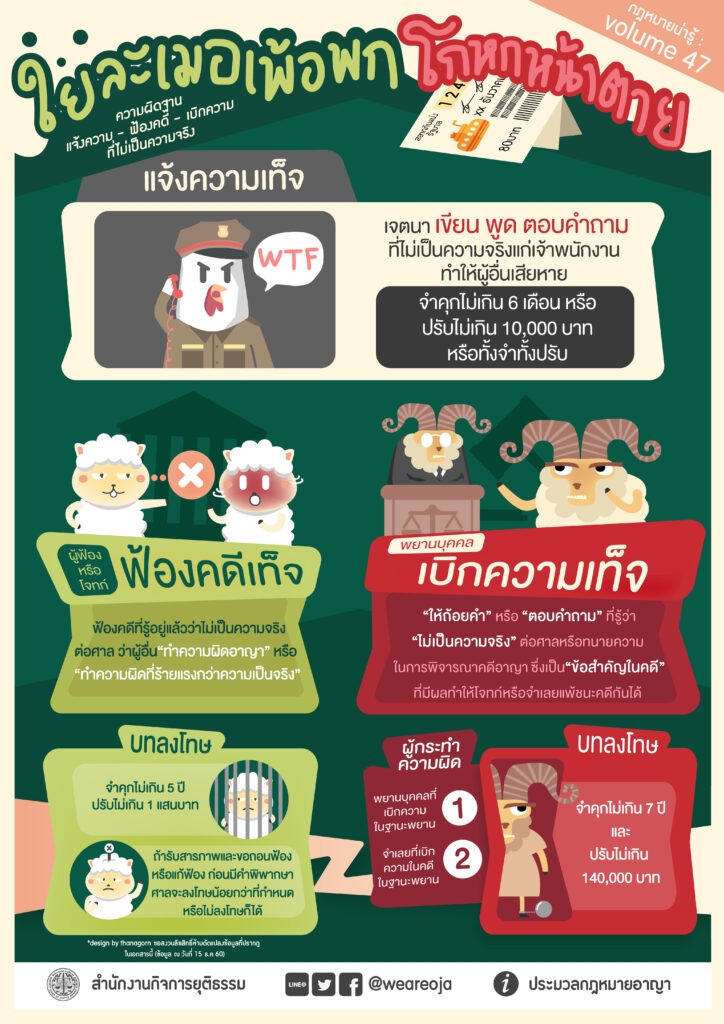 มาตรา 177 ผู้ใดเบิกความอันเป็นเท็จในการพิจารณาคดีต่อศาล ถ้าความเท็จนั้นเป็นข้อสําคัญในคดีต้องระวางโทษจําคุกไม่เกิน 5 ปี หรือ ปรับไม่เกิน 100,000 บาท หรือทั้งจําทั้งปรับถ้าความผิดดังกล่าวในวรรคแรก ได้กระทําในการพิจารณาคดีอาญา ผู้กระทําต้องระวางโทษจําคุกไม่เกิน 7 ปีและปรับไม่เกิน 140,000 บาท